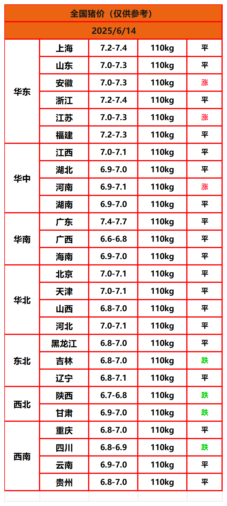 2025年6月14日猪价,今日全国猪价行情走势:3涨19平4跌。