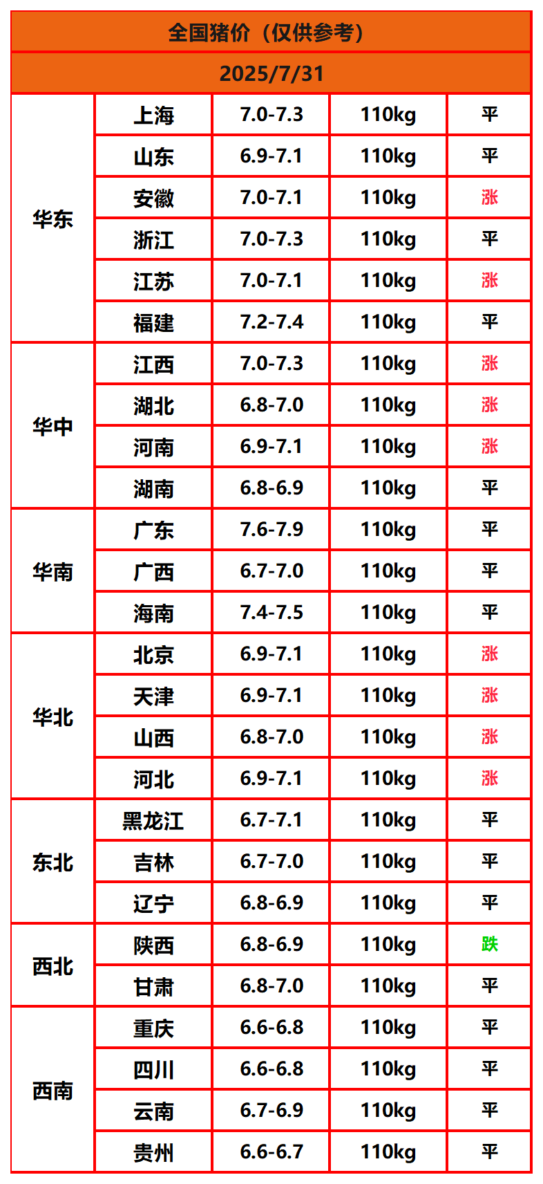 今日猪价 | 2025年7月31日全国猪价行情一览表!