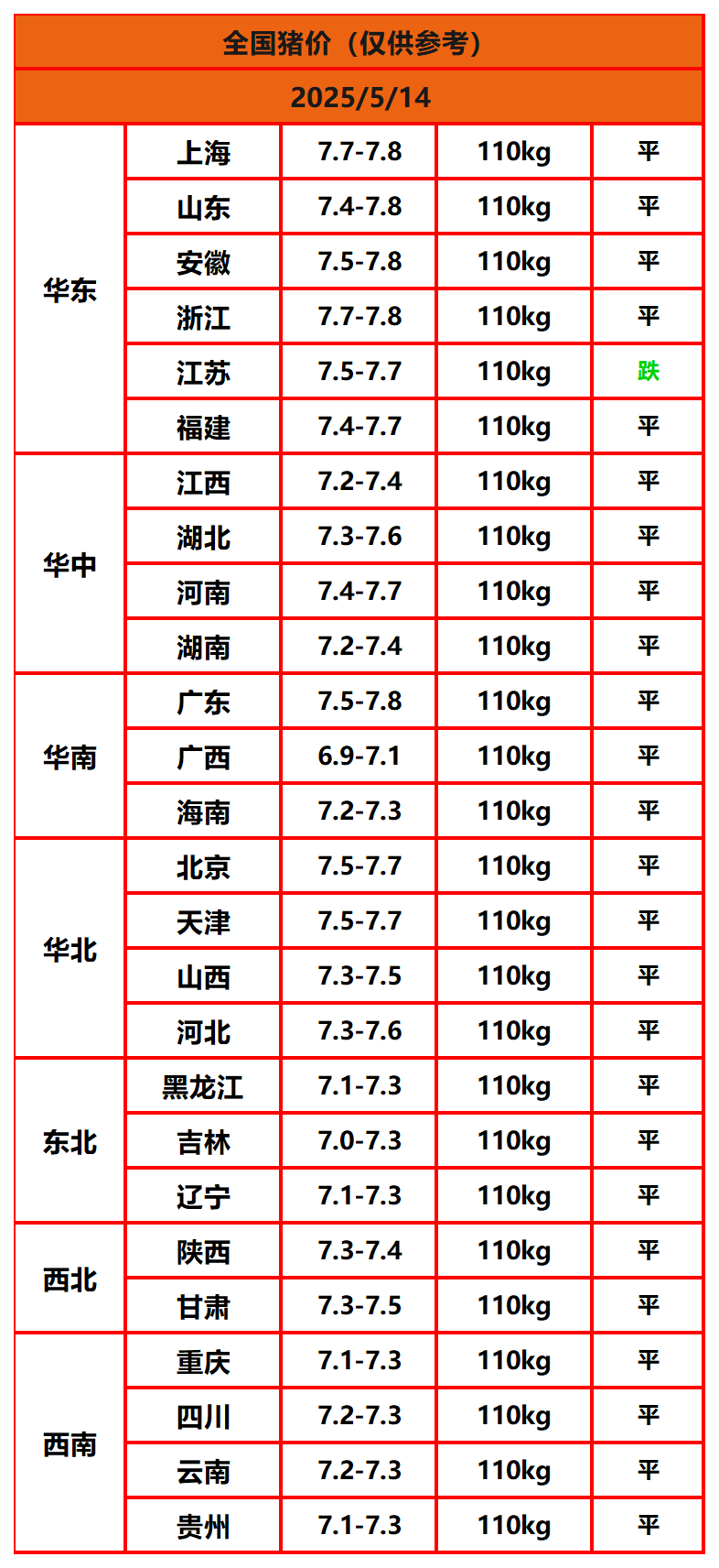 2025年5月14日猪价,今日全国猪价行情走势:0涨25平1跌。